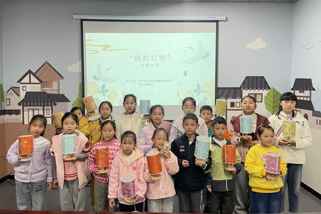 到动手制作环节,社教老师将制作材料逐一分发到孩子们手中,耐心解析台灯组装步骤与安全注意事项。现场氛围热烈而专注,孩子们一边对照教程认真操作,一边互相交流创意将原本零散的材料组装成型。当立体织锦灯罩与柔光技术相结合,一盏盏兼具古典韵味与现代实用价值的宋锦台灯应运而生,灯光透过精致的宋锦纹样,投射出斑驳的古韵光影,尽显东方美学的浪漫。制作完成后,孩子们纷纷分享自己的设计思路与制作心得,最后大家手持亲手制作的台灯合影留念,定格下这段难忘的非遗体验时光。