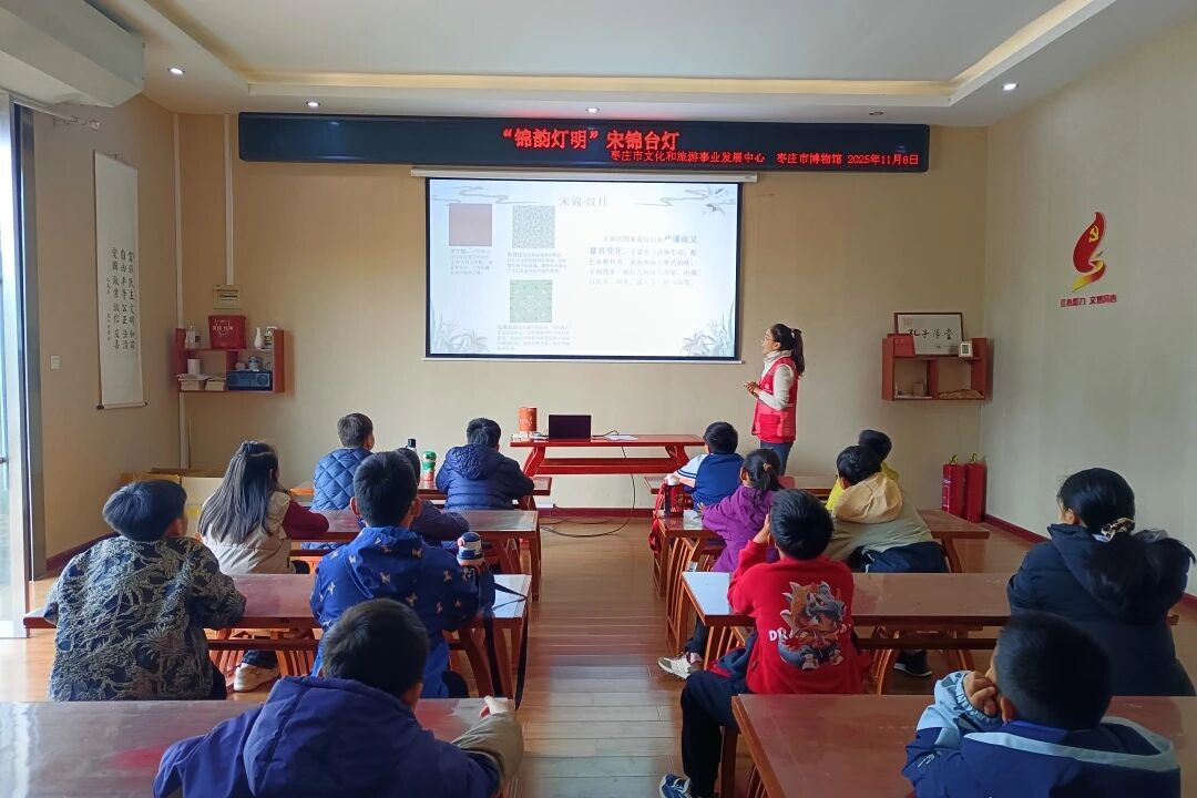 活动伊始,社教老师以生动课件为媒介,带领孩子们走进宋锦的璀璨世界,让孩子们深切感受其“锦绣之冠”的深厚底蕴。同时,巧妙串联匡衡“凿壁偷光”的典故,让孩子们在古今对照中体会照明工具的演变与文化的延续。