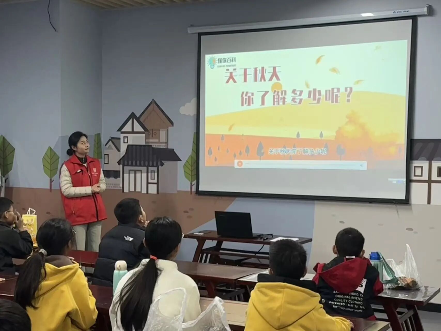 课堂上,社教老师从秋天的物候特征讲起,向同学们介绍了枫叶、梧桐叶、银杏叶等常见的秋叶形态,以及古人借秋叶抒情,传递思念的诗句。社教老师还向同学们介绍了馆藏文物——铜胄,详细介绍了“甲胄”一词的起源。