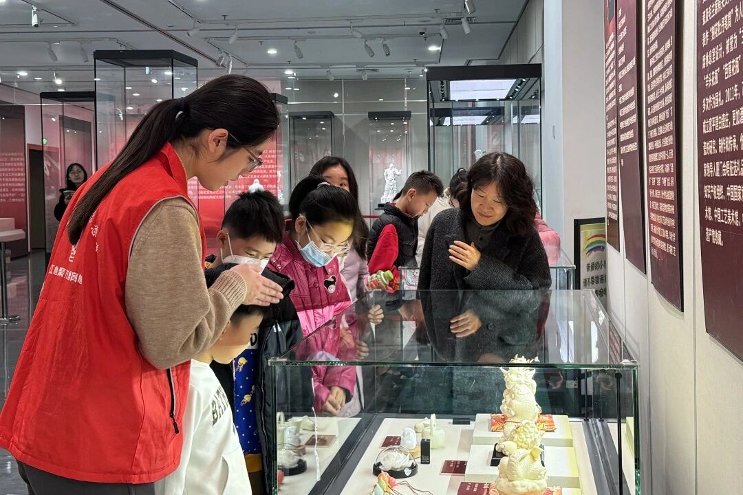 活动伊始,西馆区社教老师带领小朋友前往一楼临展参观《瓷光溢彩——“中国白·德化瓷”大师作品联展》,近距离欣赏工艺美术大师的白瓷佳作,感受德化瓷温润雅致的工艺魅力,直观领略传统瓷器的艺术底蕴。